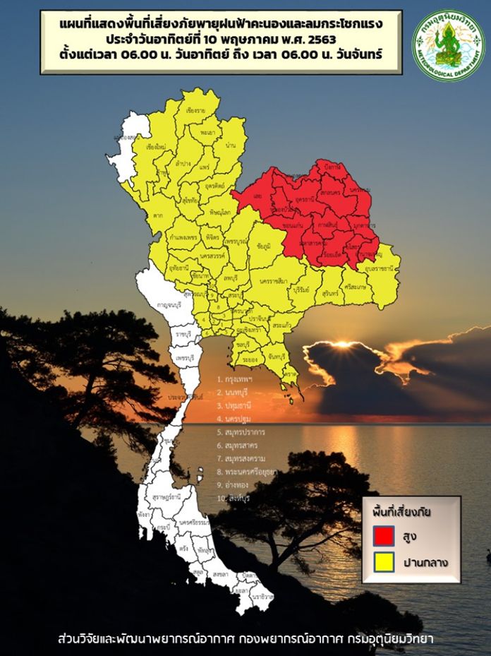 Hot. Cloudy with scattered thunderstorms with gusty wind and hail mostly in Nakhon Sawan, Lop Buri, Saraburi, Chai Nat, Ang Thong, Sing Buri, Phra Nakhon Si Ayutthaya, Nakhon Pathom, Kanchanaburi, UthaiThani, Suphanburi, Ratchaburi, Samut Songkram and SamutSakon. Minimum temperature 24-26 °C. Maximum temperature 34-36 °C. Southeasterly winds 10-30 k/hr.