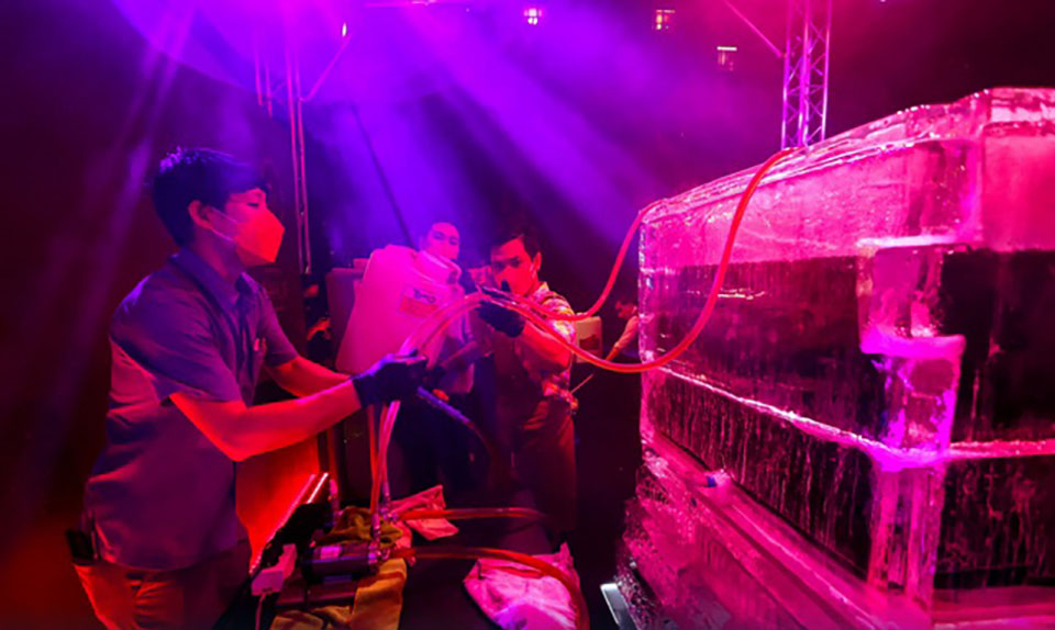 Mixologists at the Kimpton Maa-Lai Bangkok Hotel poured dozens of bottles of the key ingredients – gin, vermouth, and Campari – into an iced acrylic container 1.7 meters tall and weighing about 400 kg.