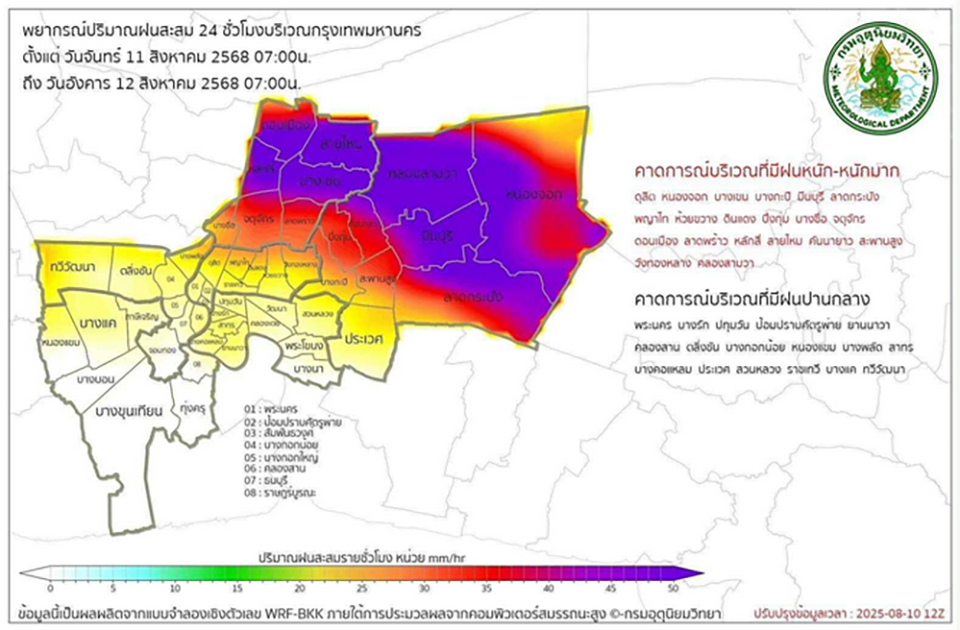 BANGKOK, Thailand – Bangkok Governor Chadchart Sittipunt has ordered city agencies to prepare for possible heavy downpours in the capital, Aug 11, focusing on the northern and eastern districts where rainfall could reach 50 mm per hour according to the Meteorological Department’s forecast.