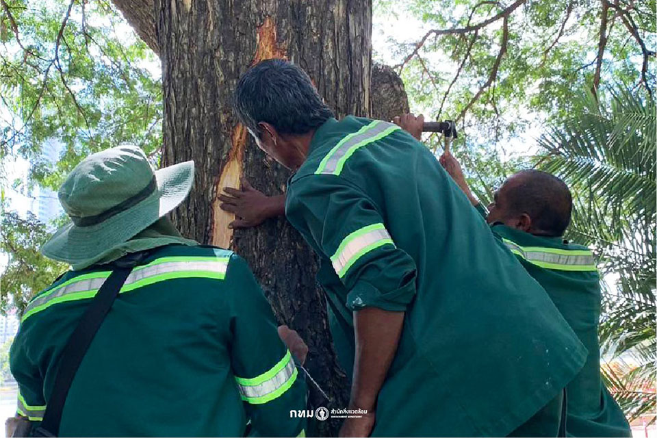 BANGKOK, Thailand – After lightning struck a large rain tree near the water feature in Benjakitti Park, leaving a triangular burn mark on its trunk, Bangkok’s “Tree Doctor” team quickly responded. Following the principles of arboriculture, they began restorative surgery to save the tree, which involved removing damaged bark, treating burn and decay areas, and applying antifungal treatments to prevent further spread.
