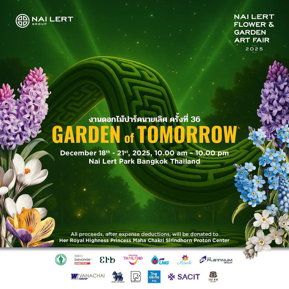 Visitors are invited to step into a blooming utopia at the 36th Nai Lert Flower & Garden Art Fair, featuring maze gardens, illuminated installations, designer showcases, workshops, and more — all in support of HRH Princess Maha Chakri Sirindhorn Proton Center.