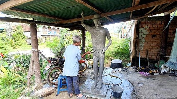 The plaster sculpture of music artist Artiwara Kongmalai, known as Toon Bodyslam, was designed based on his physical action while running. It was made by a 62-year-old local sculptor Kuson Chaiyakit, who lives in Betong, Yala.