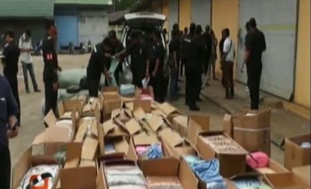 Customs Investigation and Suppression Bureau 2 director Nimit Saengampai coordinated with the Burapa Military Task Force and police from Klong Luek Station Ayanyaprathet to inspect the suspected warehouses, 50 metres from the Roang Klua Market.