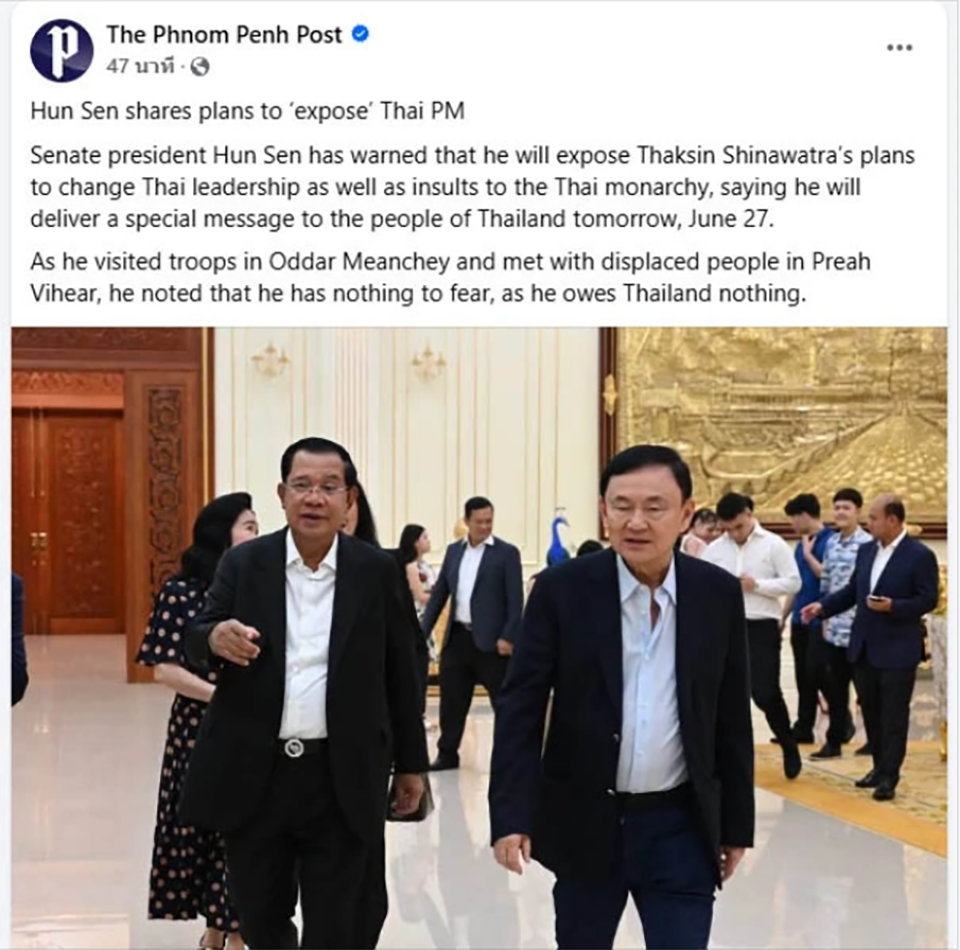 PHNOM PENH, Cambodia – Cambodian Senate President Hun Sen announced he will deliver a direct message to the Thai people on June 27, in which he plans to expose what he claims is a plot by former Thai Prime Minister Thaksin Shinawatra to change Thailand’s leadership and allegedly insult the Thai monarchy.