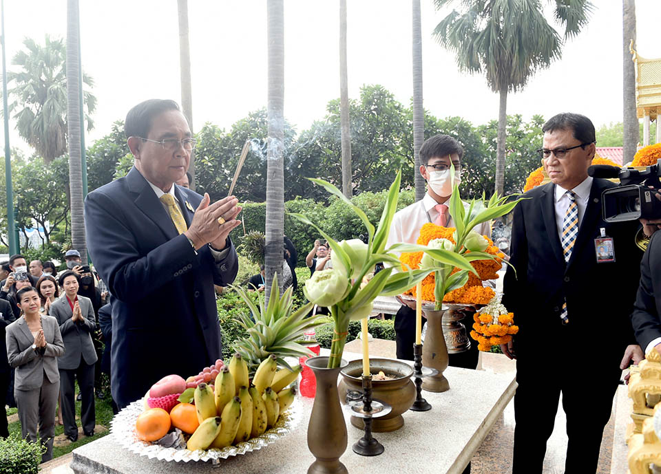 Gen. Prayut arrived at Government House for his final day of work at 09:09 AM, switching from his official vehicle to a private car. Upon disembarking, he paid respects at the shrines dedicated to guardian spirits and deities within Government House.