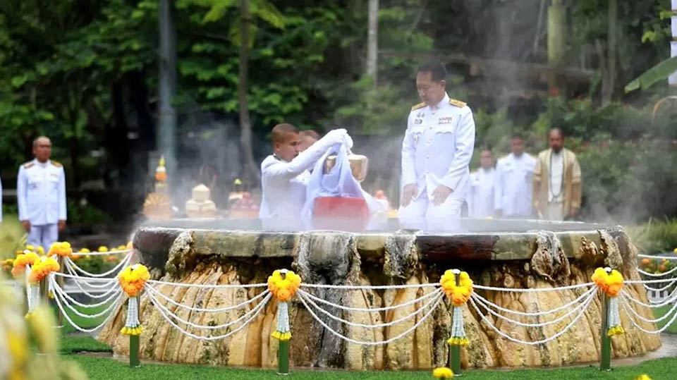 In the southern province of Ranong, the Governor conducted the sacred water collection ceremony at Raksawarin Hot Springs, the only hot spring in Thailand free from sulfur contamination. The water was collected, placed in a ceremonial bowl, and transported in a procession to Wat Suwannakiri Wihan (Royal Temple) for the consecration ceremony. (TNA)