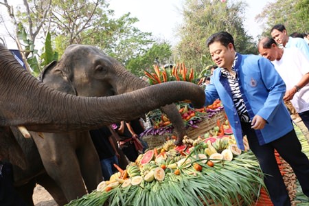Dr. Sarawut Srisakun visits one of the elephants enjoying the khantoke dinner at the party.