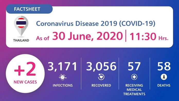 NewsThailandUpdate COVID-19 Coronavirus Disease 2019 (COVID-19) situation in Thailand By Pattaya Mail June 30, 2020 0 1549 Share on Facebook Tweet on Twitter tweet Coronavirus Disease 2019 (COVID-19) situation in Thailand as of 30 June 2020, 11.30 Hrs.