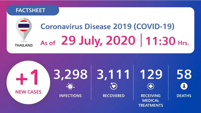 NewsThailandUpdate COVID-19 Coronavirus Disease 2019 (COVID-19) situation in Thailand By Pattaya Mail July 30, 2020 0 1585 Share on Facebook Tweet on Twitter tweet Coronavirus Disease 2019 (COVID-19) situation in Thailand as of 29 July 2020, 11.30 Hrs. (TAT)