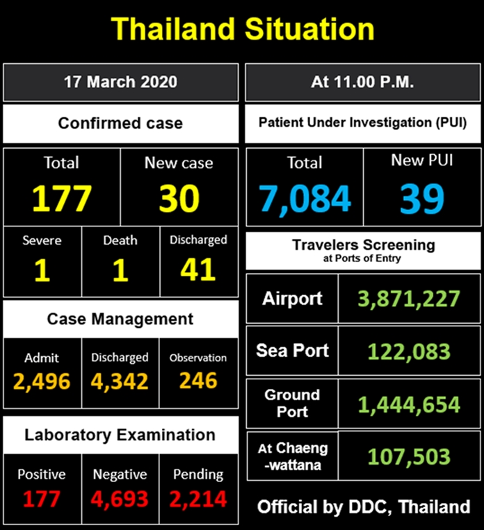 Health & WellbeingNewsThailand COVID-19 Situation in Thailand – Numbers of Confirmed Cases, Patients under Investigation (PUI) By Pattaya Mail March 18, 2020 0 2238 Share on Facebook Tweet on Twitter tweet COVID-19 Situation in Thailand – Numbers of Confirmed Cases, Patients under Investigation (PUI) 17 March, 2020 at 11:00 P.M. (Sources: Thailand’s Ministry of Public Health, Department of Disease Control)