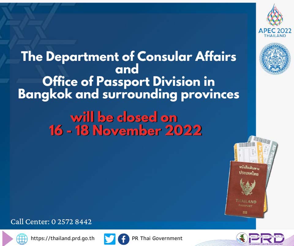According to the announcement of the Ministry of Foreign Affairs of the Kingdom of Thailand, the Department of Consular Affairs and the Office of Passport Division in Bangkok and surrounding provinces will be closed on 16-18 November 2022 because the Government has announced a public holiday during the APEC Economic Leaders’ Week.