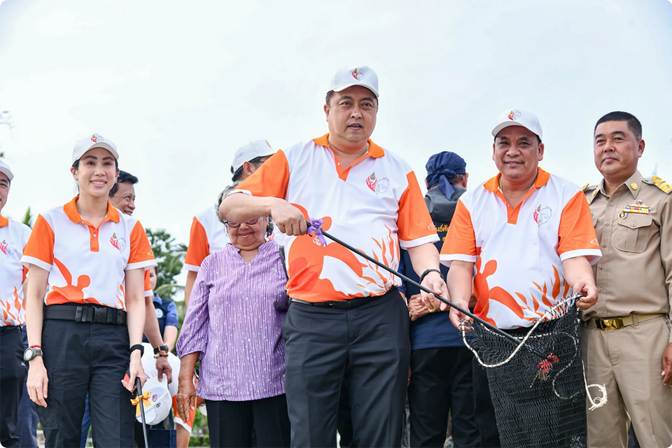 Later that day, the Deputy Prime Minister presided over the launch of a marine waste cleanup on Koh Phangan under the Project for Coral Reef and Marine Life Conservation initiated by Her Royal Highness Princess Sirivannavari Nariratana Rajakanya. Volunteer divers collected marine debris and handed it to the Pollution Control Department for proper disposal. Suchart also took part in a beach cleanup at Thong Sala Public Park and distributed cleaning equipment to local volunteers.