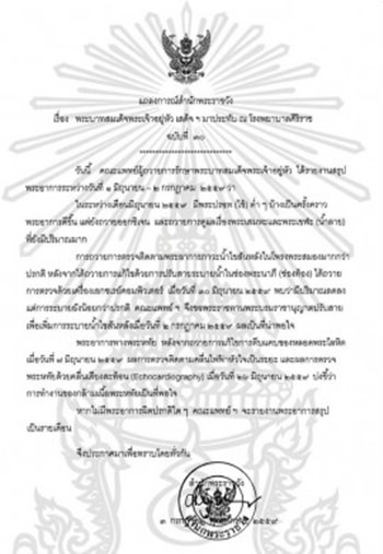Doctors at Siriraj hospital who have been treating HM the King gave a summary report of the health condition of the King during June 1-July 2 as follows: