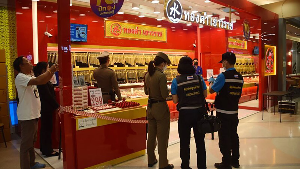 CHANTHABURI, Thailand – Police responded to a gold theft incident at the well-known Yaowarat Gold Shop inside a major shopping mall in Chanthaburi at 10:40 AM on October 24. The suspect, a man between 35-38 years old, was described as wearing a yellow shirt, blue jeans, and a mask to cover his face, with a noticeable earring on his left ear.