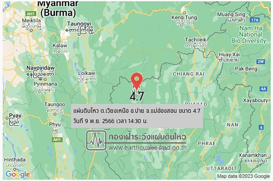 The Thai Meteorological Department reported an earthquake in Wiang Nuea Subdistrict, Pai District, Mae Hong Son Province, at around 2.30PM today (Nov 9).