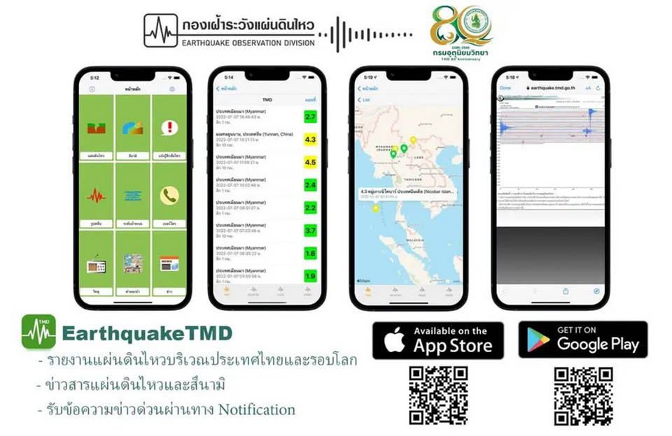 Earthquake TMD is available on both iOS and Android devices. It provides instant notifications about earthquakes in Thailand and globally, gathering data from domestic sources and international monitoring agencies such as the United States Geological Survey, the European-Mediterranean Seismological Center, and Germany’s GEOFON. Users receive detailed information, including the location, magnitude, depth, time of the earthquake, and its distance from their current position.