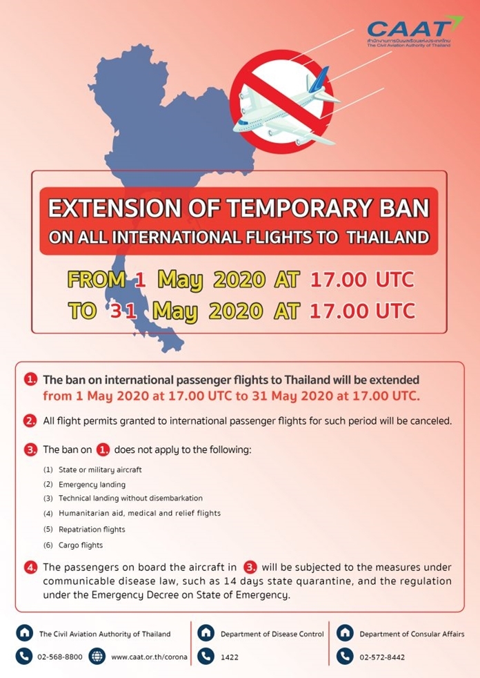 1.) The ban on international passenger flights to Thailand will be extended from 1 May 2020 at 17.00 UTC to 31 May 2020 at 17.00 UTC.