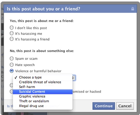 To apply this feature, other facebook users can click ‘report this’ when seeing any post/status that leads to suicide and the system will offer options such as contacting the user or his/her friends and suggesting suicide preventing hotline.