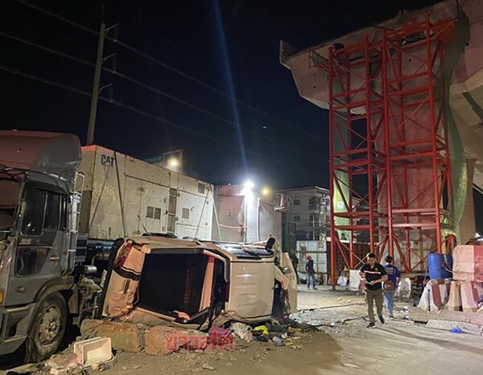 BANGKOK, Thailand – A pickup truck fell off the under-construction elevated road on On Nut-Lat Krabang Road, near Suk Samran Intersection in Lat Krabang District, September 29. The vehicle plummeted from a height of over 10 meters and crashed onto a 22-wheeler parked below, injuring a family of three, including a one-year-old child.