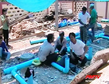 The two laborers, one Thai and one Burmese were transferred to Banglamung hospital. The Burmese man suffered a broken leg and bruises on his body.