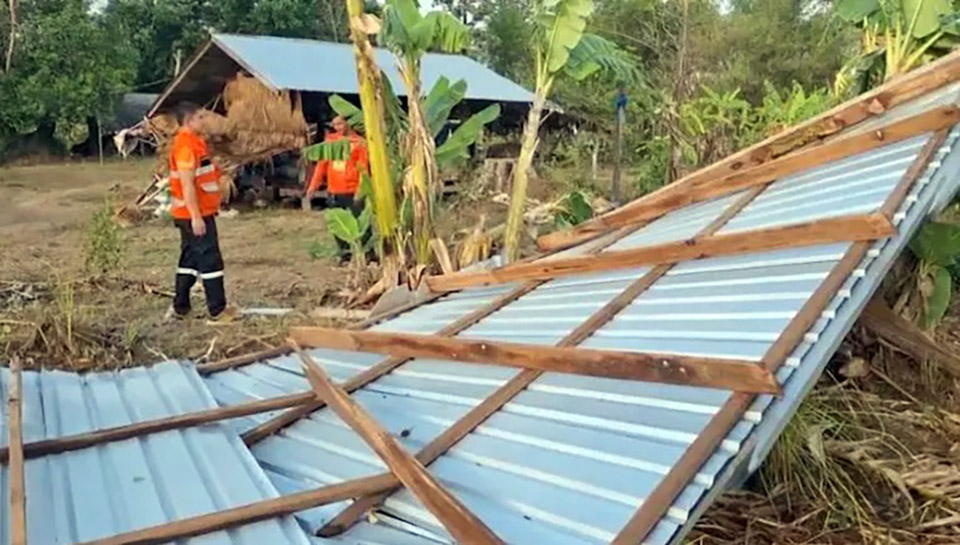 In Mukdahan Province, the summer storm accompanied by wind and rain brought hail, resulting in damage to several areas. The severe storm caused houses and livestock sheds to lose their roofs due to the strong winds. (TNA)