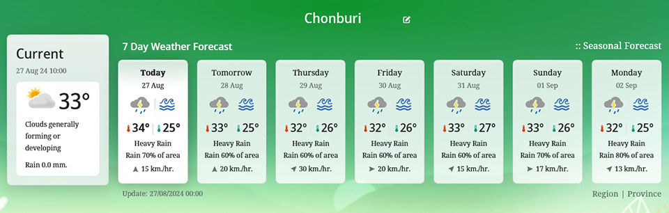 Residents in these areas are advised to be cautious of potential dangers from heavy rainfall and accumulated rain, which may result in flash floods and landslides, especially in low-lying areas near hillsides and waterways. The weather conditions are due to the monsoon trough moving across the upper northern and northeastern regions, coupled with a stronger southwest monsoon covering the Andaman Sea, Thailand, and the Gulf of Thailand. Meanwhile, a low-pressure system is forming over northern Laos.