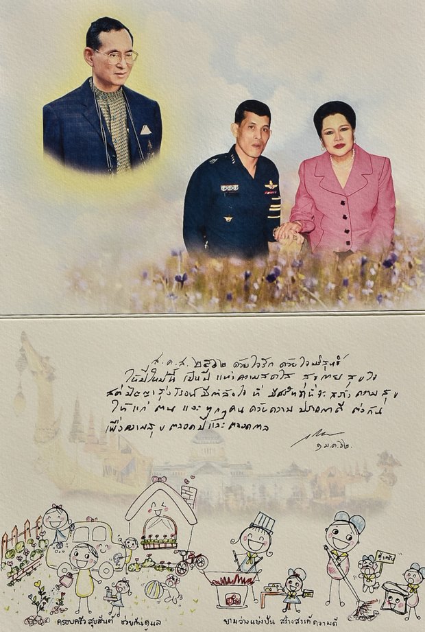Inside the card, there is a picture of HM the late King Bhumibol on the left, and the portraits of His Majesty, and Her Majesty Queen Sirikit on the right.