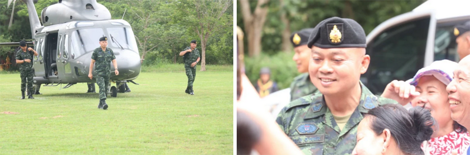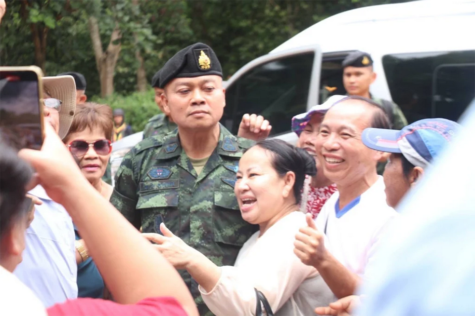 As the commander arrived, a large crowd of locals and tourists who had been visiting the ancient Khmer temple near the post gathered to show their support. Many approached Lieutenant General Boonsin to offer words of encouragement, embrace him, and chant “chaiyo” (a Thai cheer of triumph), while others posed for photos with him.