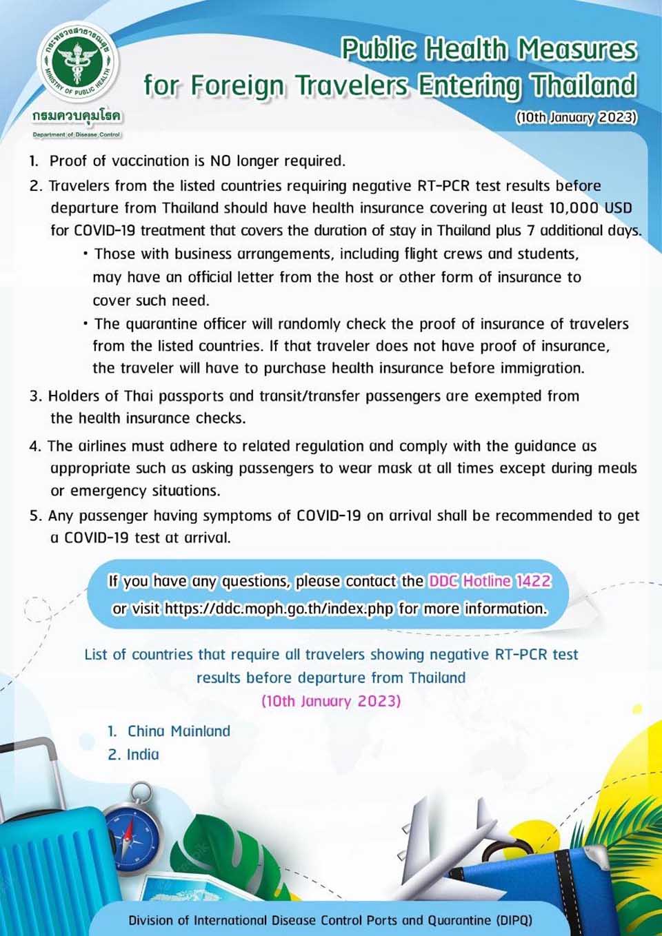 Chiangmai MailNewsThailandTourism & Sports Measures for foreign travelers entering Thailand By Pattaya Mail January 12, 2023 0 1506 Share on Facebook Tweet on Twitter tweet Infographics. Public health measures for foreign travelers entering Thailand (updated 10th January 2023). Source: Division of International Disease Control Ports and Quarantine (DIPQ) (TAT)