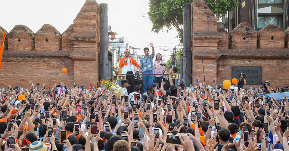 Mr. Pita met people at the Hangdong municipal market Thursday afternoon and traveled in a convoy to thank his supporters from the Tha Phae gate, Chiang Mai’s landmark to San Sai district where he addressed the crowd at the Sansai Luang municipal park. (TNA)
