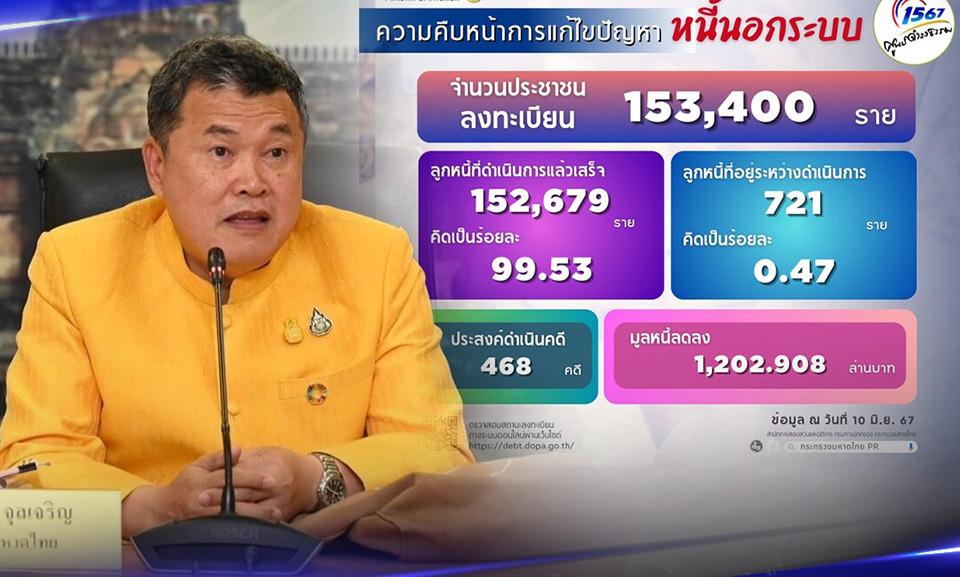 Permanent Secretary for Interior Suttipong Juljarern reported that the ministry had launched a registration system for citizens dealing with informal debts, drawing 153,400 registrants. Teams from relevant units are actively mediating between creditors and debtors to resolve these cases. Currently, 721 cases are still in mediation, with efforts underway to conclude them promptly. As many as 468 cases have also been referred to local police for additional legal action.