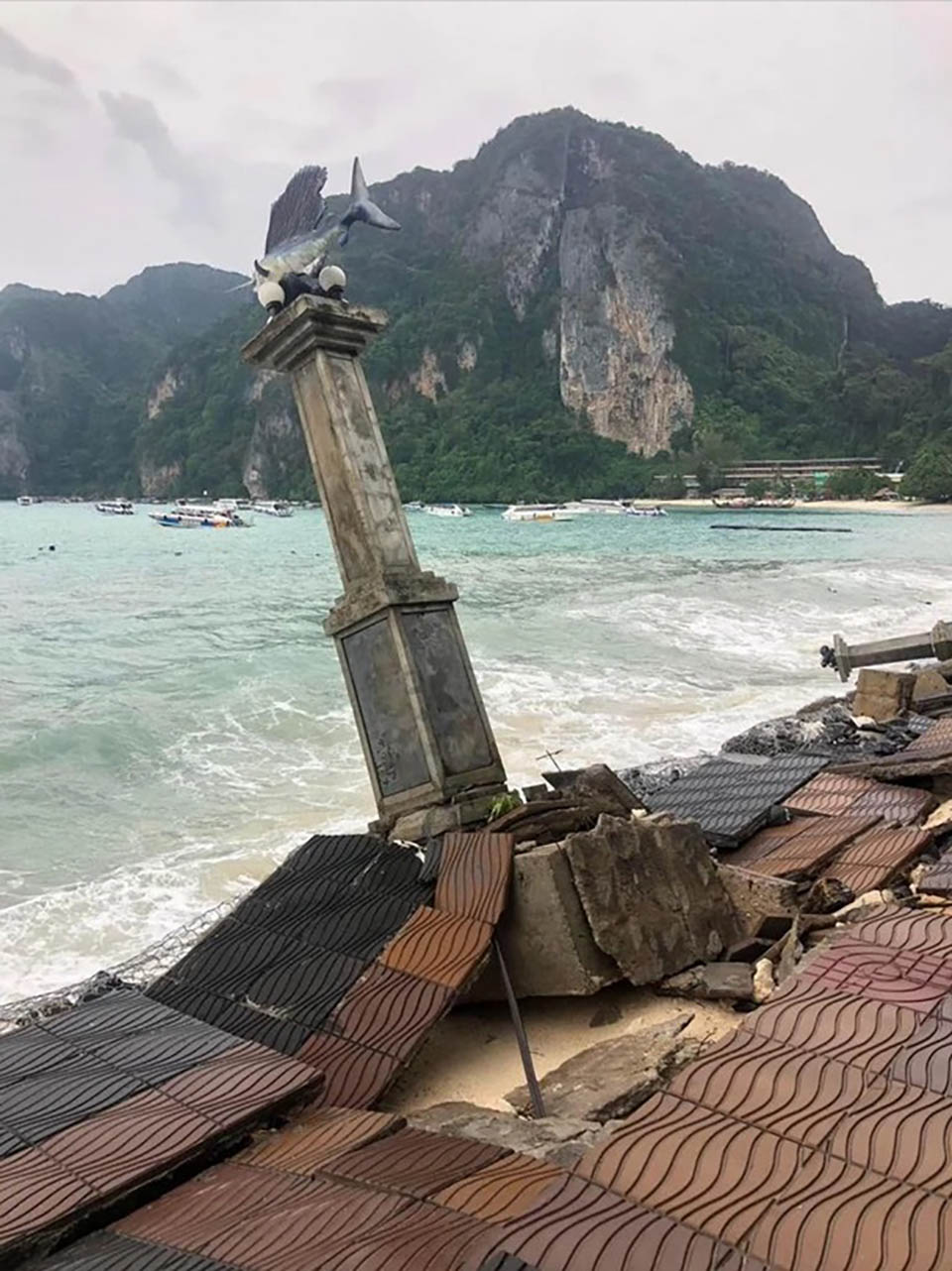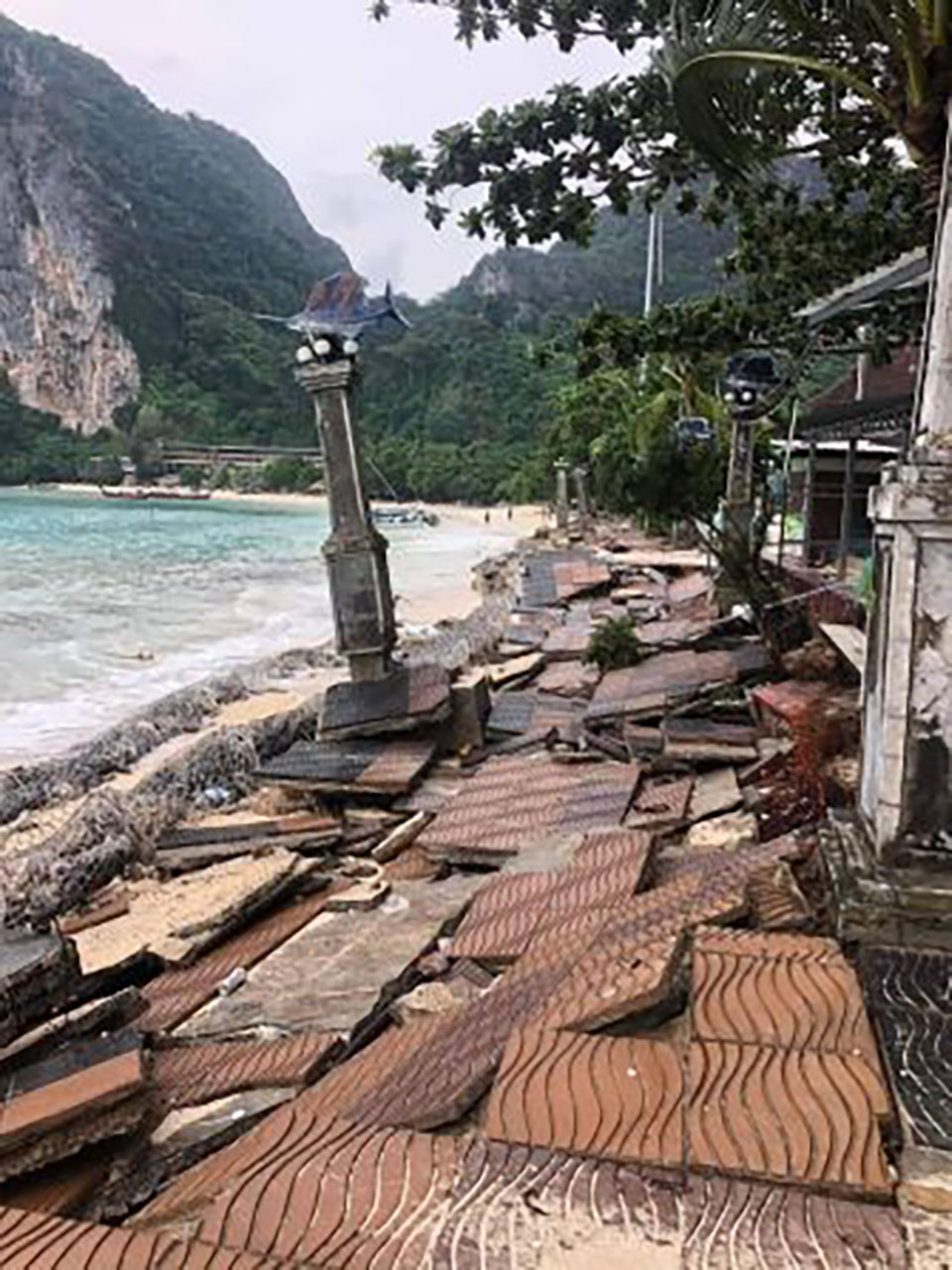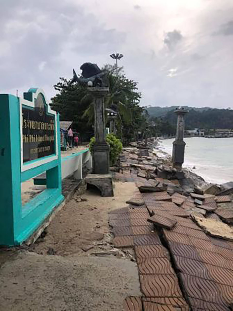 The storm surge dislodged paving stones and knocked over cement posts along the walkway, causing extensive damage to the coastal defenses. In addition, more than ten long-tail and speed boats were reported damaged or sunk due to the waves.