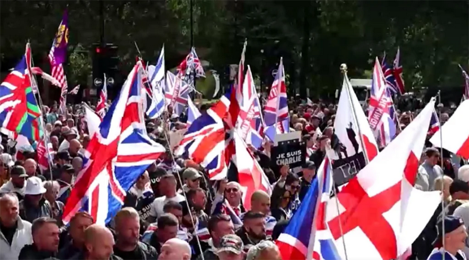 This rally was the largest anti-immigration gathering in the UK this summer, a period marked by protests outside hotels housing migrants. Participants carried Union Jack flags and Saint George’s Cross flags.