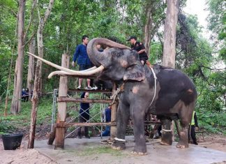 Thai elephant “Plai Sak Surin” celebrates home-coming in the rain
