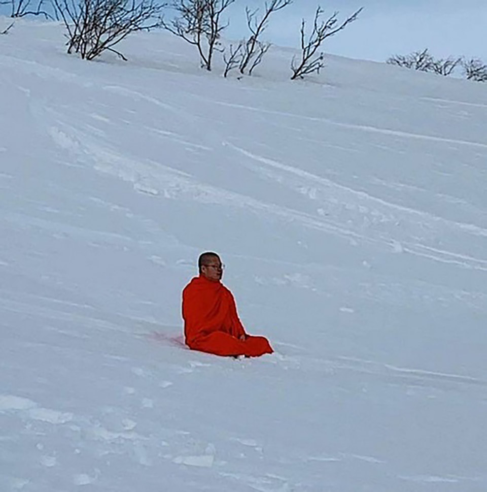 BANGKOK, Thailand – After a viral Facebook post showing Phra V. Vajiramedhi meditating on snow in Japan stirred controversy, Phra Phayom Kalyano, abbot of Wat Suan Kaew in Nonthaburi, stepped forward to clarify that the action does not violate monastic discipline, October 20. He suggested that Phra V. Vajiramedhi was likely testing his endurance.