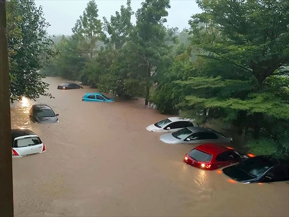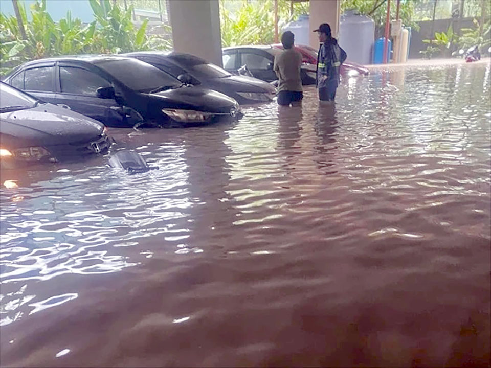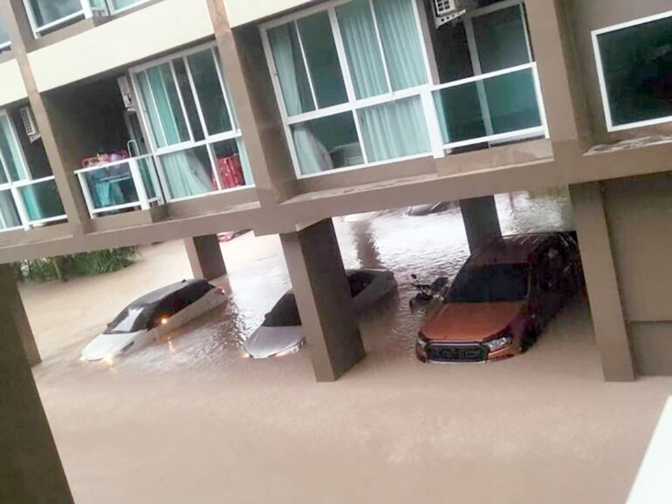 Heavy downpours caused flooding in many zones of Thalang district. A condominium building near Phuket airport was in deep floodwater and the motorcycles and cars of dwellers were inundated. Floodwater rose too fast for vehicle owners to move them. At least 40 cars and 20 motorcycles were under water there.