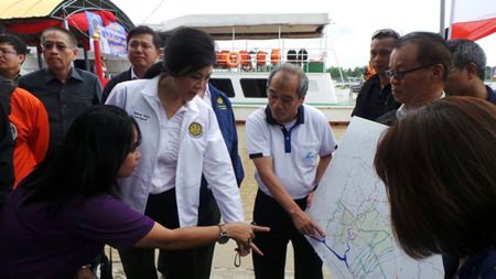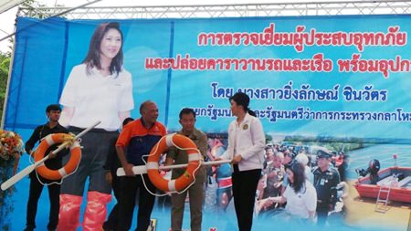 During her trip to Pathum Thani, Miss Yingluck visited Wat Bot in Sam Khok District of the province. She then took a boat ride along Chao Phraya River to inspect the areas where water level was high. She also presented 360 rescue boats and water machines to the Department of Disaster Prevention and Mitigation.