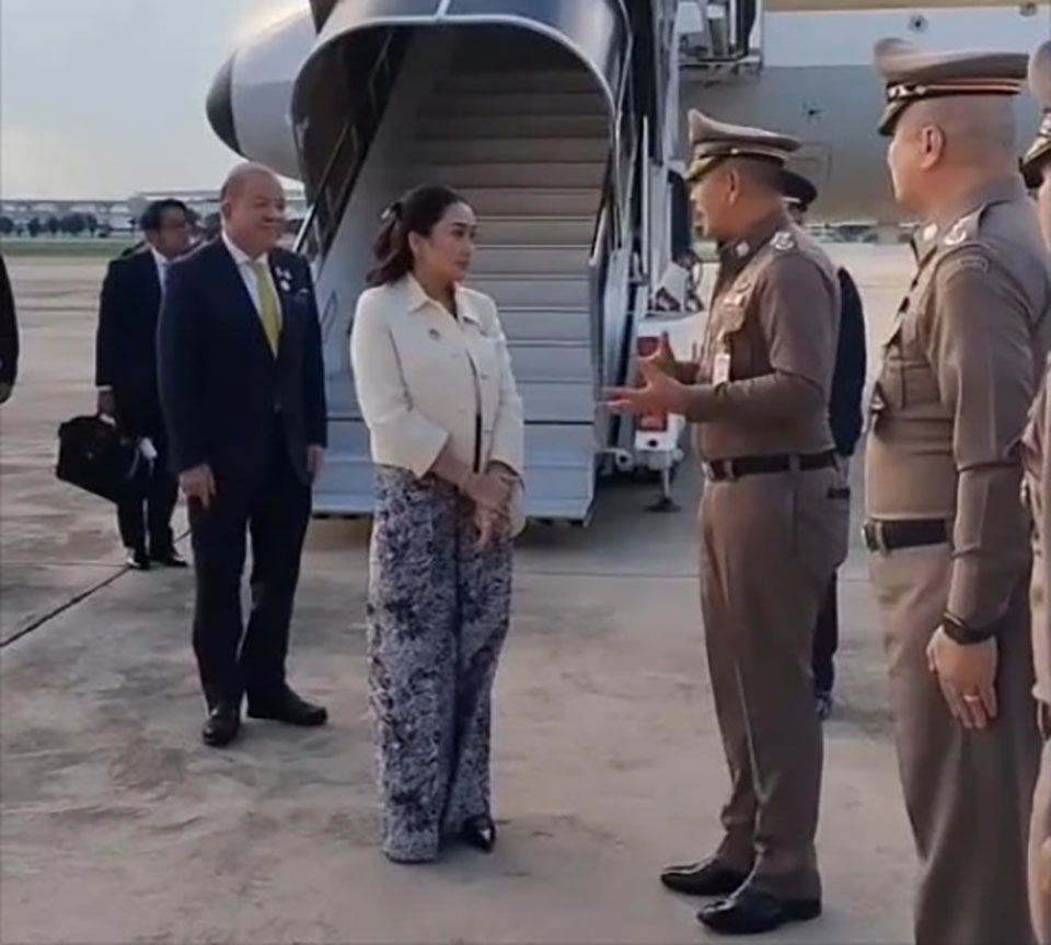 BANGKOK, Thailand – Prime Minister Paetongtarn Shinawatra returned from participating in the ASEAN Summit in Laos at 5 PM on October 11. Upon arrival at Military Airport 2, Wing 6, she greeted reporters with a friendly “Sabaidee” (Lao for “hello”) but did not respond to questions regarding the recent death of Thai workers in Israel or the case involving the direct sales company, The Icon Group. The Prime Minister acknowledged feeling tired before quickly departing.