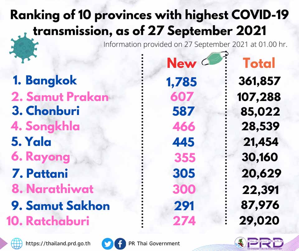 NewsThailandUpdate COVID-19 Ranking of 10 provinces with highest COVID-19 transmission as of September 27 By Pattaya Mail September 27, 2021 0 1635 Share on Facebook Tweet on Twitter tweet (PRD)