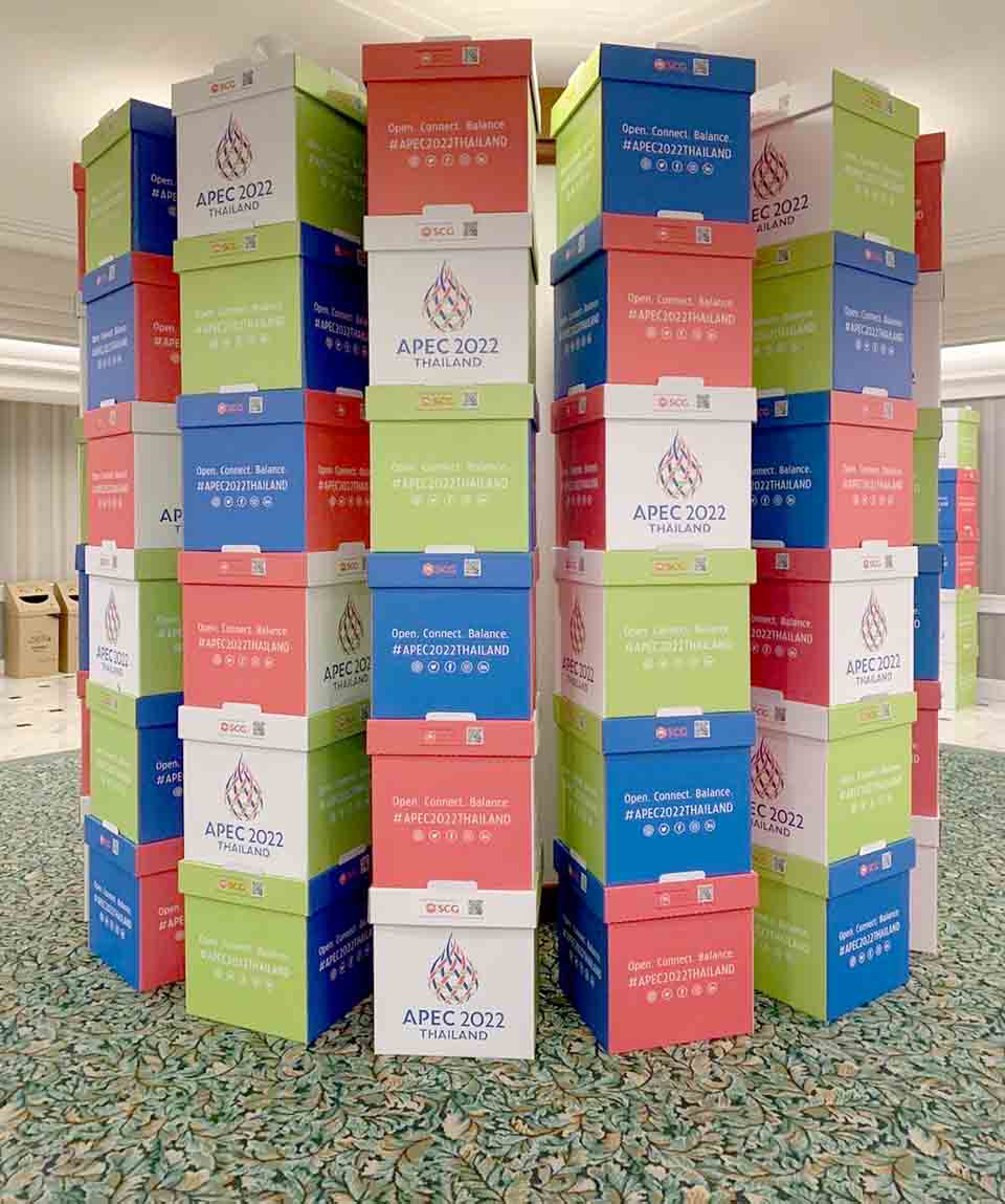 Hosting the APEC 2022 all year long shall provide Thailand with great opportunities. However, it would not be memorable if numerous meetings ended in “wasteful assemblies” of discarded booths, signages, tables, or documents. Hence, SCG proceeds to support the ESG (Environmental, Social, and Governance) notion to build a green environment and sustainable society. SCG is collaborating with Thailand’s Ministry of Foreign Affairs to bring about the “Green Meeting” for the APEC 2022 Thailand. This involves considerations to optimize resource consumption to reduce the effects on the environment by providing “Green Arrangements” or meeting necessities made from recycled paper.