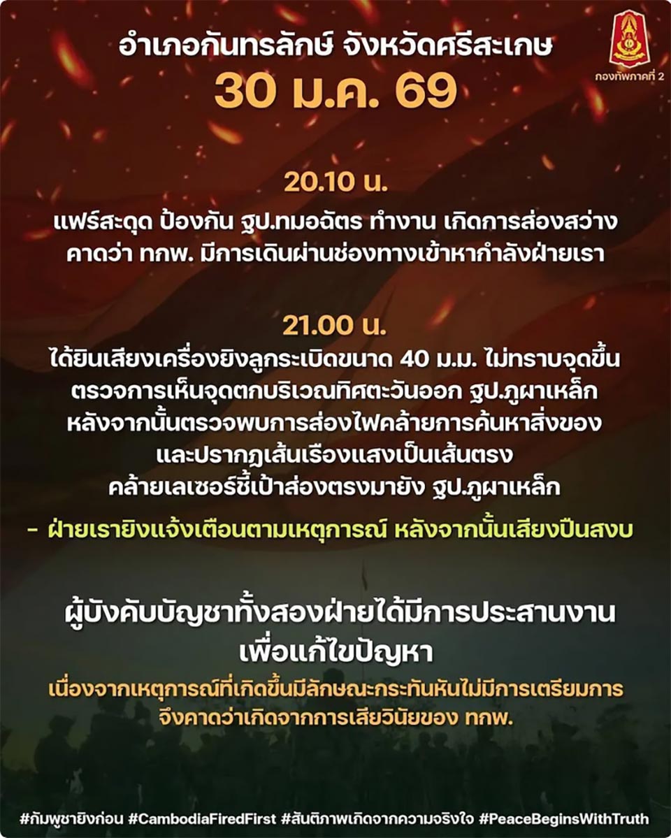 BANGKOK, Thailand – The Second Army Region has reported an incident that occurred on the night of January 30, 2026, in Kantharalak District, Sisaket Province.