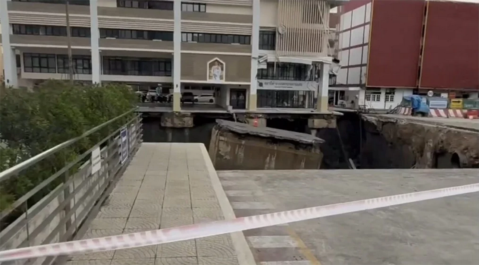 According to the EIT, a sinkhole in front of Vajira Hospital could get bigger as a persistent water leak continues to destabilize the ground.