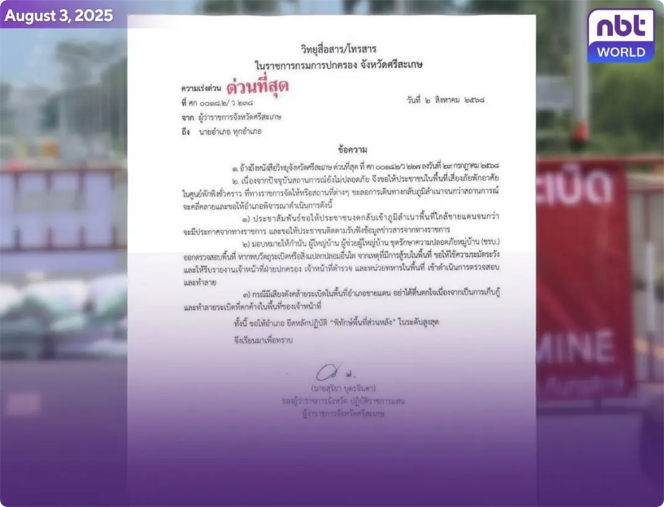 BANGKOK, Thailand – Sisaket province has issued a warning to residents living near the Thai–Cambodian border, urging them not to return home due to ongoing security risks. As of 9:00 p.m. on August 2, the Provincial Public Relations Office, under Deputy Governor Suriya Butjinda, instructed all district chiefs to inform evacuees that it is still unsafe to return and that they must remain in temporary shelters or safe areas until further notice.