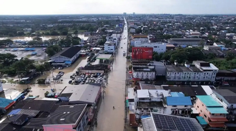 Aerial footage shows that while the city center remains partially submerged, the water levels have decreased significantly compared to the previous day. However, certain areas, such as Phatthanakan Khu Khwang Road, continue to be flooded. Despite the receding waters, the economic hub remains inundated along its six-kilometer stretch, with water levels ranging from 30 to 50 centimeters.