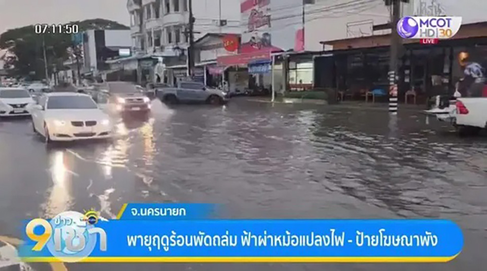 In Nakhon Nayok, severe storm on Monday triggered flooding in the Muang Nakhon Nayok municipality areas, toppling billboards and structures. A transformer was struck by lightning, leading to a fire at a roadside coffee stall.