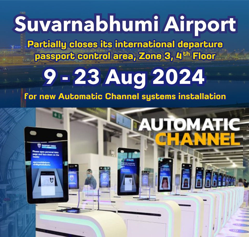 To improve its flexibility and speed for passport control services, Suvarnabhumi Airport (BKK) is installing new Automatic Channel systems and equipment, during 9 – 23 August 2024 and, therefore, has to partially close its international departure passport control area, Zone 3, on 4th Floor during the time. For the time being, all passengers can use remaining available counters for departure. Suvarnabhumi Airport staff are standing by for your assistance.