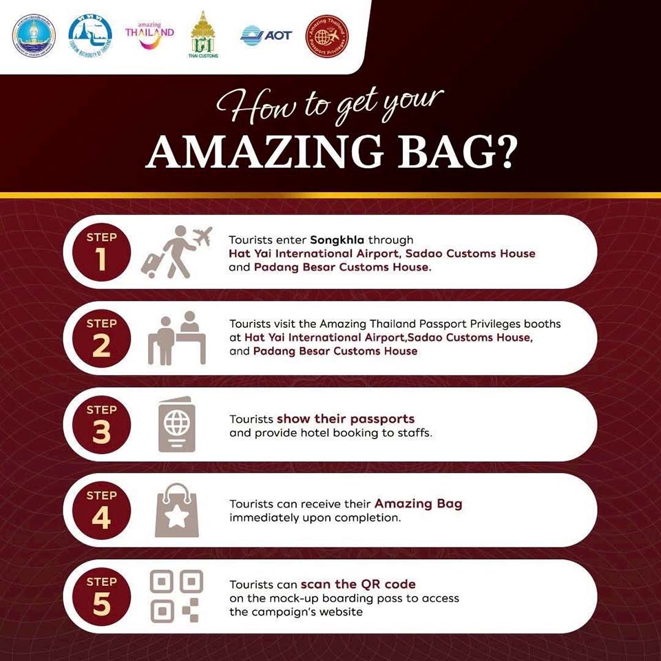 International travellers arriving via Hat Yai International Airport, Sadao Customs Checkpoint, or Padang Besar Customs Checkpoint during the campaign period can participate by presenting their passport at designated activity booths to receive an Amazing Bag. A QR code inside provides access to exclusive privileges redeemable across participating establishments throughout Southern Thailand.