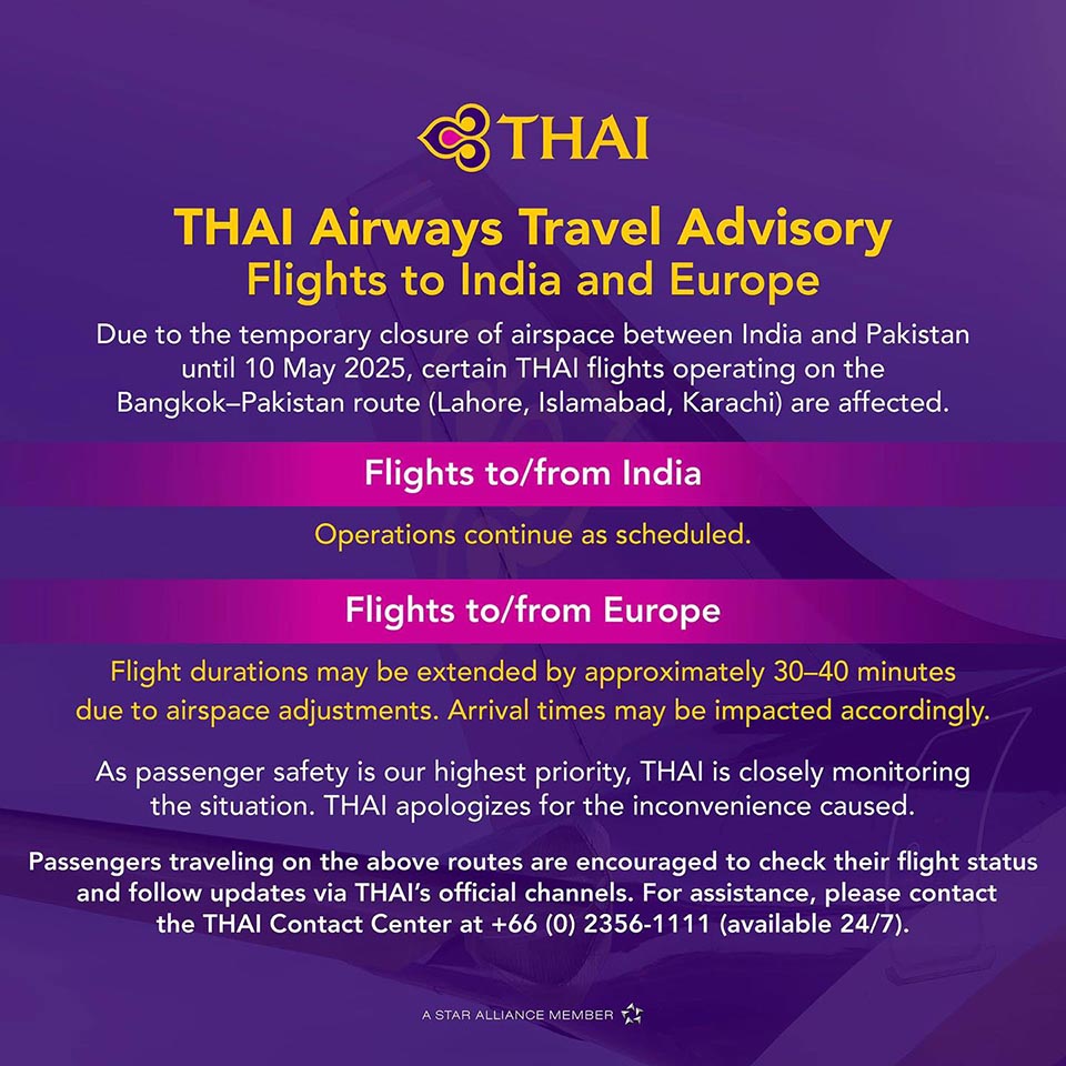 BANGKOK, Thailand – Due to temporary airspace closures between India and Pakistan, some flights to and from Pakistan (Lahore, Islamabad, Karachi) have been affected. Flights to India are operating as scheduled, while flights to Europe may experience delays of 30–40 minutes due to adjusted flight routes.