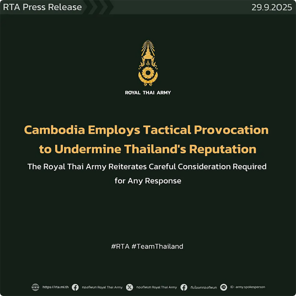 Royal Thai Army says Cambodia is using staged provocations and media narratives to portray Thailand as the aggressor, urging a measured response combining diplomacy, political action, and military vigilance to protect sovereignty.