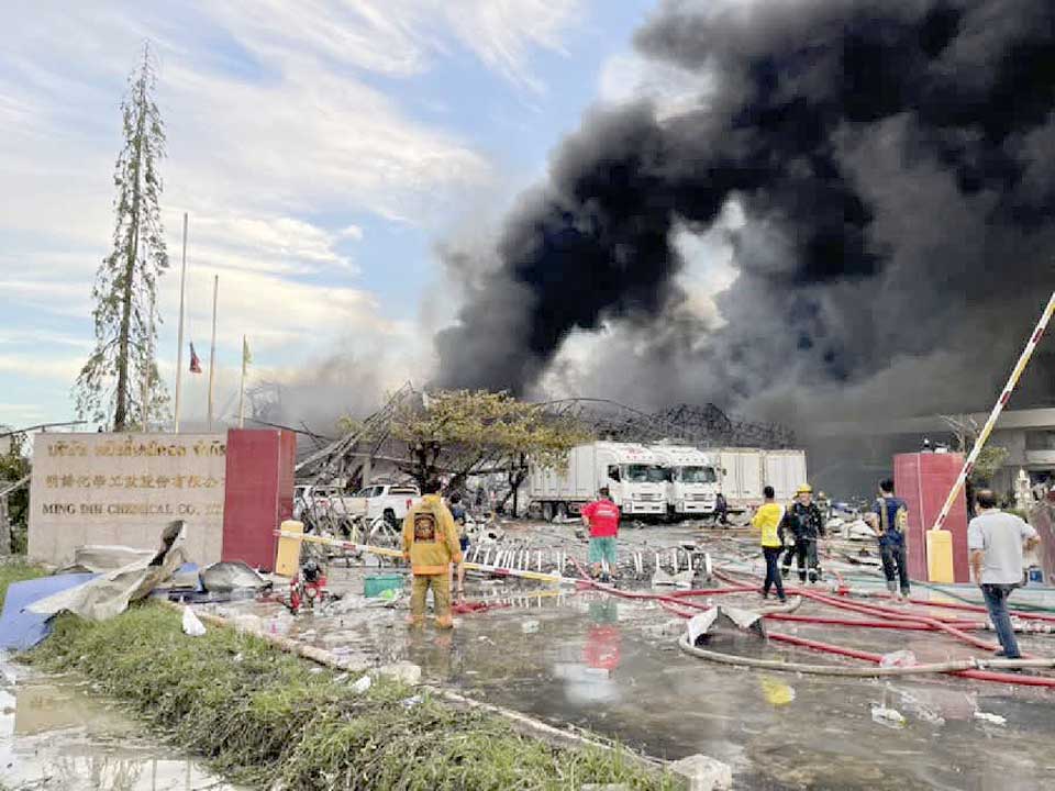 The department said the inferno began with an explosion about 3.10am Monday morning, but it has not yet determined what caused the blast. The effort to extinguish the chemical fire sent thick black smoke billowing into the sky above Bang Phli district throughout the day yesterday, which was visible from many parts of the capital. (NNT)